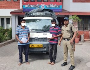 योगेश यादव पुत्र नंदकिशोर यादव निवासी किरायेदार दर्शन कोरी एस.जी.आर.आर कॉलेज के बगल में, चंदननगर देहरादून,उम्र 26 वर्ष ,अनिल कुमार पुत्र संतराम कौशल निवासी किरायेदार श्याम साइकिल वाला, चंदननगर देहरादून उम्र 28 वर्ष को13 (तैरह) पेटी अवैध अंग्रेजी शराब 8pm व्हिस्की, छोटा हाथी नंबर UK07-CB-8086