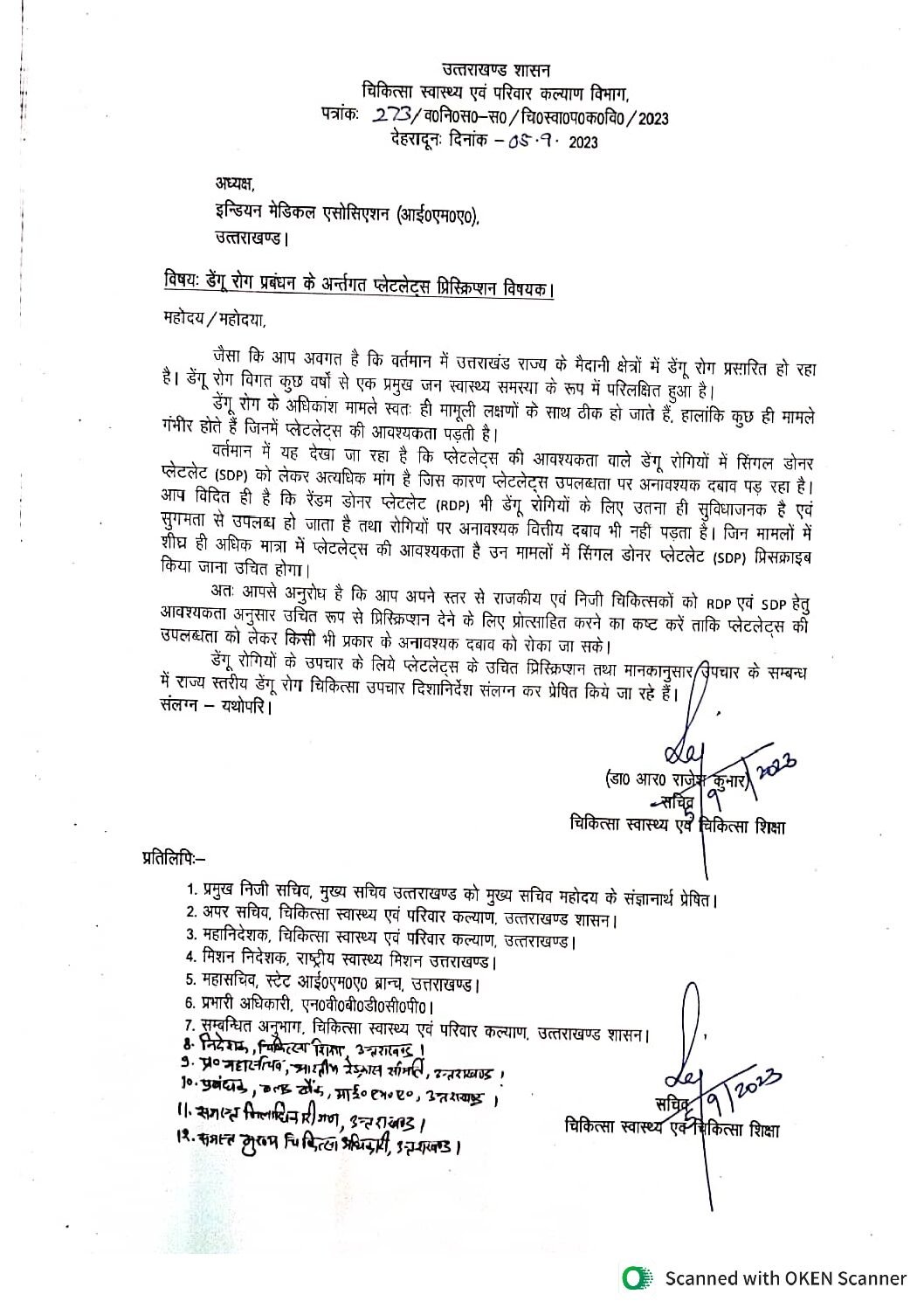 स्वास्थ्य सचिव डॉ आर राजेश कुमार ने डेंगू रोग के इलाज के लिए प्लेटलेट्स के समुचित प्रबंधन के लिए आईएमए अध्यक्ष को लिखा पत्र