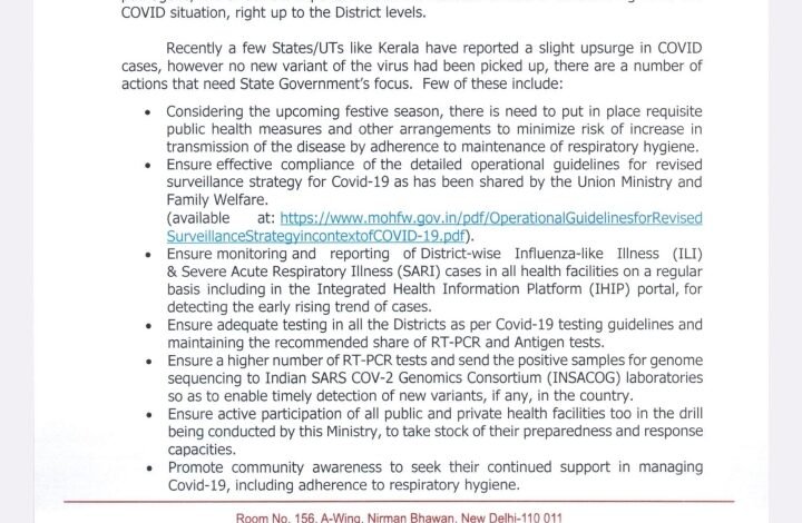 स्वास्थ्य सचिव डॉक्टर आर राजेश कुमार ने राज्य के समस्त जिला अधिकारी, समस्त मुख्य चिकित्साधिकारी को पत्र लिखा है। कृपया उपर्युक्त विषयक सचिव, स्वास्थ्य एवं परिवार कल्याण मंत्रालय, भारत सरकार के पत्र संख्या DO.NO.2.28015/182/2021-DMCell दिनांक 18 दिसम्बर 2023 (संलग्न) का संदर्भ ग्रहण करने का कष्ट करें जिसके द्वारा अवगत कराया गया है कि विगत कुछ दिनों में कुछ राज्यों में कोविड-19 के रोगियों की संख्या में वृद्धि दर्ज की गई है। इसी कम में जनपद स्तर पर कोविड-19 के प्रसार को रोकने के लिए निरंतर निगरानी की जानी अतिआवश्यक है।