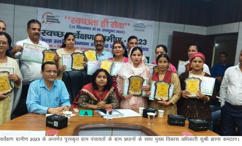 मुख्य विकास अधिकारी झरना कमठान द्वारा आज विकासभवन में आयोजित कार्यक्रम में स्वच्छ सर्वेक्षण ग्रामीण 2023 के अन्तर्गत जनपद में जनसंख्या श्रेणी के स्व-मूल्यांकन एवं सहकर्मी सत्यापन के आधार पर चयनित श्रेष्ठ 12 ग्राम पंचायतों को पुरस्कृत किया गया। मुख्य विकास अधिकारी ने उपस्थित ग्राम प्रधान एवं अधिकारी कर्मचारियों को स्वचछता की शपथ दिलाई। स्वच्छता ही सेवा पखवाड़े के अन्तर्गत इस वर्ष की मुख्य थीम ‘‘ कचरा मुक्त भारत’’ को लेकर विगत 02 नवम्बर 2022 से कार्यक्रम गतिमान है जो 02 अक्टूबर 2023 तक संचालित होंगे।