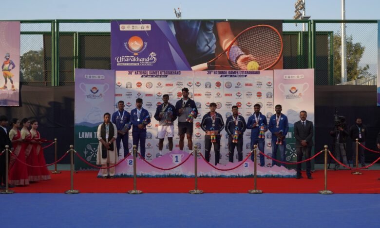 देहरादून के परेड ग्राउंड स्थित टेनिस कोर्ट में 38वें राष्ट्रीय खेल की लॉन टेनिस स्पर्धा के सातवें और अंतिम दिन रोमांचक फाइनल मुकाबले खेले गए। मिश्रित युगल, पुरुष एकल और महिला एकल के फाइनल में शानदार प्रदर्शन देखने को मिला, जहां तमिलनाडु, सर्विसेज और गुजरात ने स्वर्ण पदक पर कब्जा जमाया।