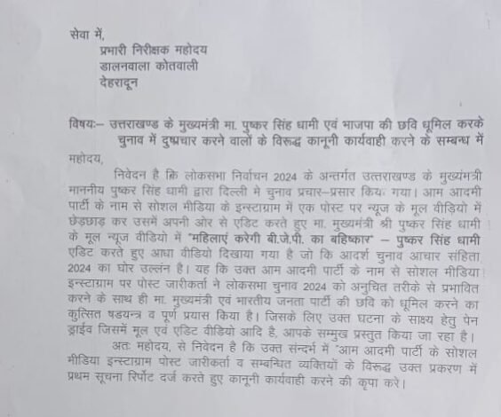 आप की सोशल मीडिया सेल द्वारा मुख्यमंत्री धामी का दिल्ली में चुनाव प्रचार प्रसार के दौरान दिए एक बयान के वीडियो के साथ छेड़छाड़ की गई है । इस एडिटेड वीडियो में दर्शाया गया है कि सीएम महिलाओं द्वारा भाजपा के बहिष्कार की बात स्वीकार रहे हैं । यह वीडियो आम आदमी पार्टी के नाम से सोशल मीडिया के इंस्टाग्राम में एक पोस्ट से प्रसारित किया का रहा है, जो आदर्श चुनाव आचार संहिता का घोर उल्लंघन है । इस पोस्ट के जारीकर्ता ने लोकसभा चुनाव को अनुचित तरीके से प्रभावित करने के साथ ही मुख्यमंत्री धामी एवं भारतीय जनता पार्टी की छवि को धूमिल करने का कुत्सित प्रयास किया गया है । इस संबंध में पार्टी की तरफ से उक्त आरोप के समर्थन में साक्ष्य भी प्रस्तुत किए गए हैं । पार्टी ने अपने पत्र में इस संबंध में आम आदमी पार्टी के सोशल मीडिया इंस्टाग्राम पोस्ट जारीकर्ता एवं संबंधित व्यक्तियों के विरुद्ध उचित कानूनी कार्रवाई करने की मांग की है।